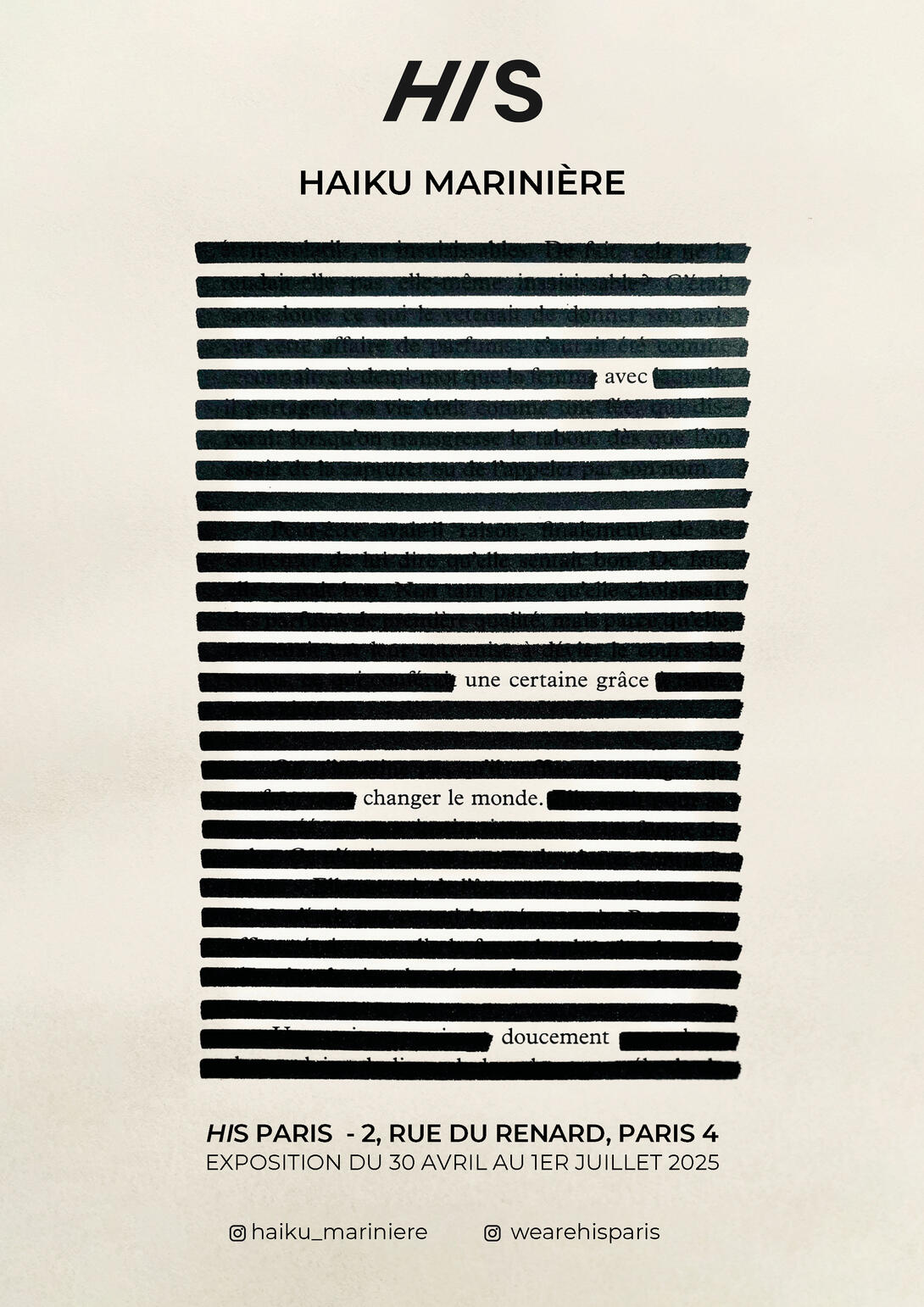 Pour célébrer le printemps, HIS Paris accueille l’univers onirique de l’artiste Dimitri Rataud, créateur de «Haiku marinière». Du 30 avril au 1er Juillet 2025, l’artiste originaire de Bretagne investit le concept store japonais avec ses pages délicates et inspirantes. Avec d’un côté, le haiku, poème japonais d’une extrême simplicité et de l’autre, la marinière et ses rayures emblématiques, Haiku marinière joue avec les mots de la littérature française et les codes de la poésie nippone pour délivrer une oeuvre singulière, où cohabitent les deux cultures. «Je révèle la poésie cachée dans les pages ordinaires», souligne Dimitri Rataud.