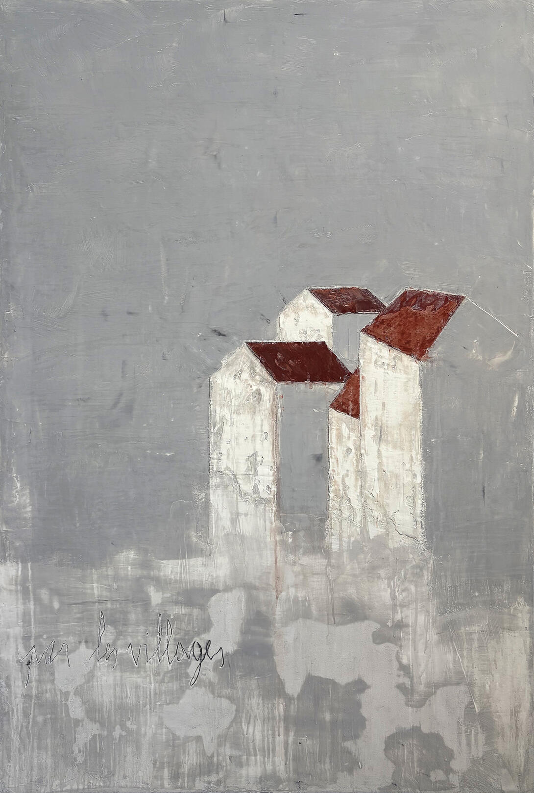 Les villages de Jean-Pierre Schneider n’existent pas. Plus précisément, ils n’existent nulle part ailleurs que sur une carte secrète appartenant à l’artiste. Plus encore qu’à l’ordinaire, les « choses » y perdent leur matérialité : devenues transparentes, elles flottent dans un espace à deux dimensions. Ici et là, une église au sommet d’une colline, silhouette élancée vers le ciel, ou deux ou trois maisons rejetées vers les marges de la toile et réduites à des murs blancs coiffés d’un toit rouge, rappellent les cubes avec lesquels les enfants bâtissent des habitations sommaires. (Extrait du texte d’Itzhak Goldberg, historien d’art, pour l’exposition)