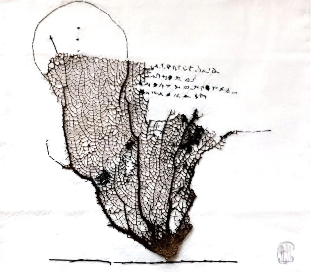 Fascinée par les fleurs, les feuilles et les arbres, avec le peu et le simple, des matériaux bruts, comme le coton, une feuille à dessin, quelques photos instantanées, j'ai laissé cours à mon imagination. C'est au milieu des éléments : eau, nuages, vent, soleil, lune ; avec des gestes lents, qu'inspire la broderie que je me suis laissée guider par tous les trésors venus de la nature.