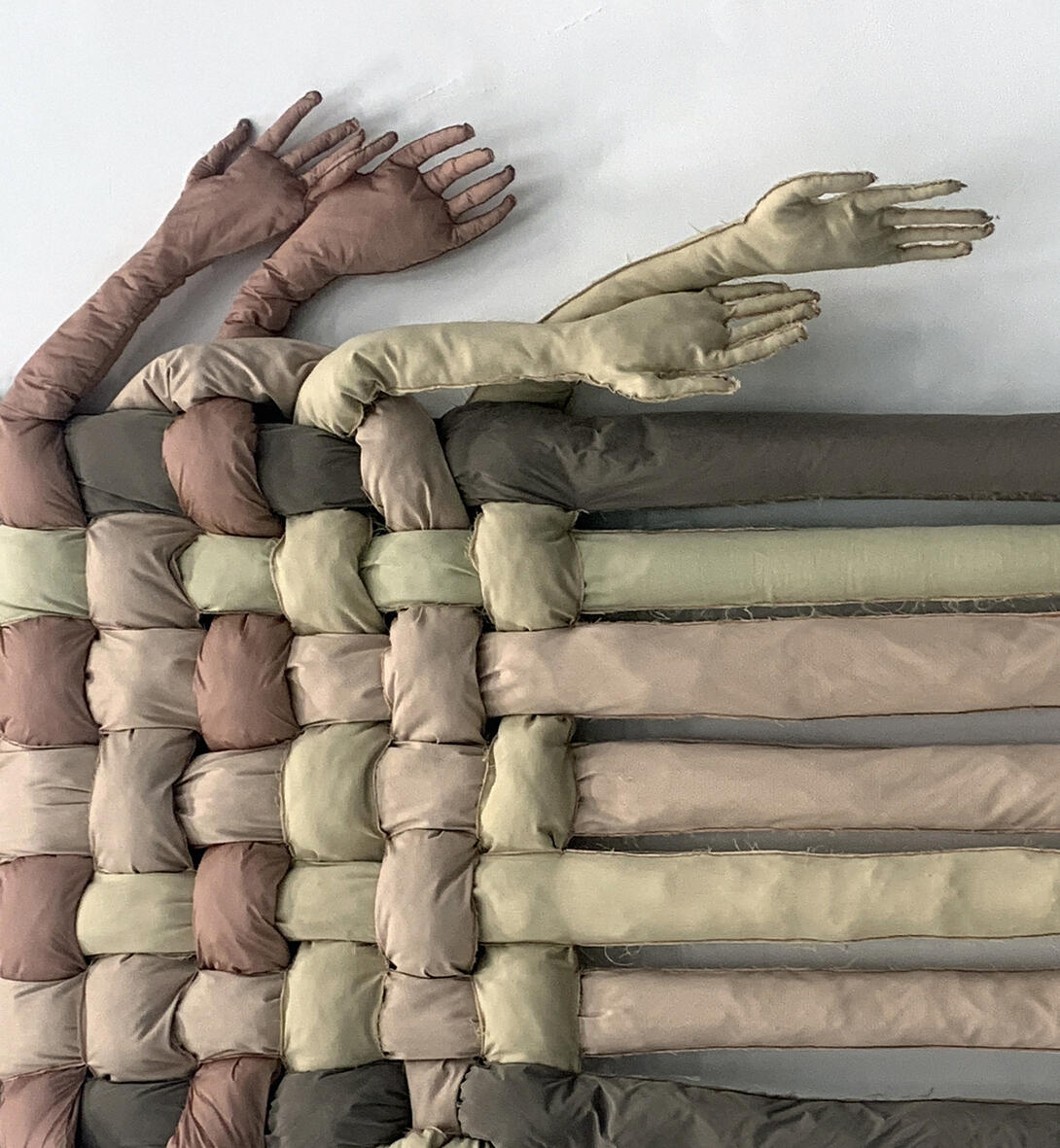 As a synecdoche for the human body perceived as medium and catalyst of experiences beyond itself—as part for whole, as element within a much wider multitude (for instance, through interweaving in a textile assemblage with monumental allure)—the depiction of hands reveals the complex relationship between control and freedom, presence and absence, connection and solitude, hope and despair, dissociation and interdependence. The loss of self, abandonment, dissolution, and helplessness to which the artist’s project ultimately refers, comment on the status of the witness in relation to one’s own condition—a status that pushes the human being to the margins of humanity. Contemporary ecocide thus equates with a progressive and silent anthropocide, in which humans themselves seem to become exponents of what has been called “ghost species.”