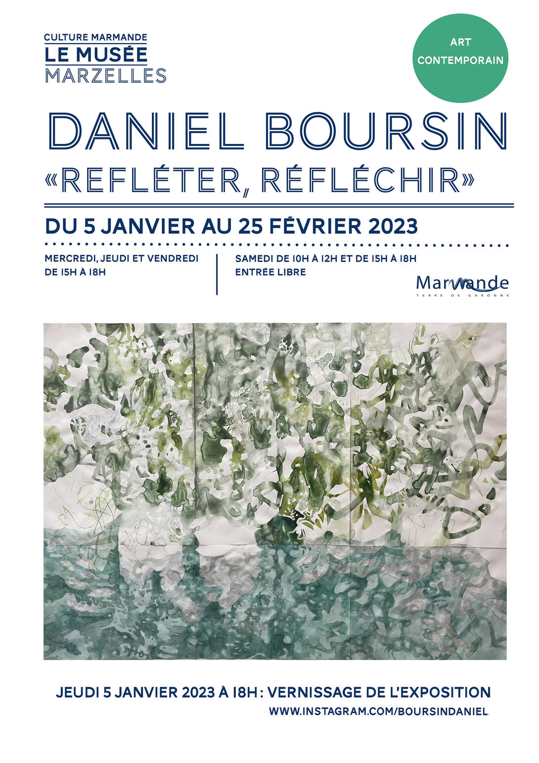 Pour sa première exposition solo dans un musée national, Daniel Boursin présente sous le titre "refléter, réfléchir" un ensemble d'un quarantaine de pièces de plusieurs périodes de son travail. Sujets et modes de productions se répondent : Ondoyance et dilution des fluides, reflets de la lumière à la surface des eaux, présences minérales, arborescence des végétaux.