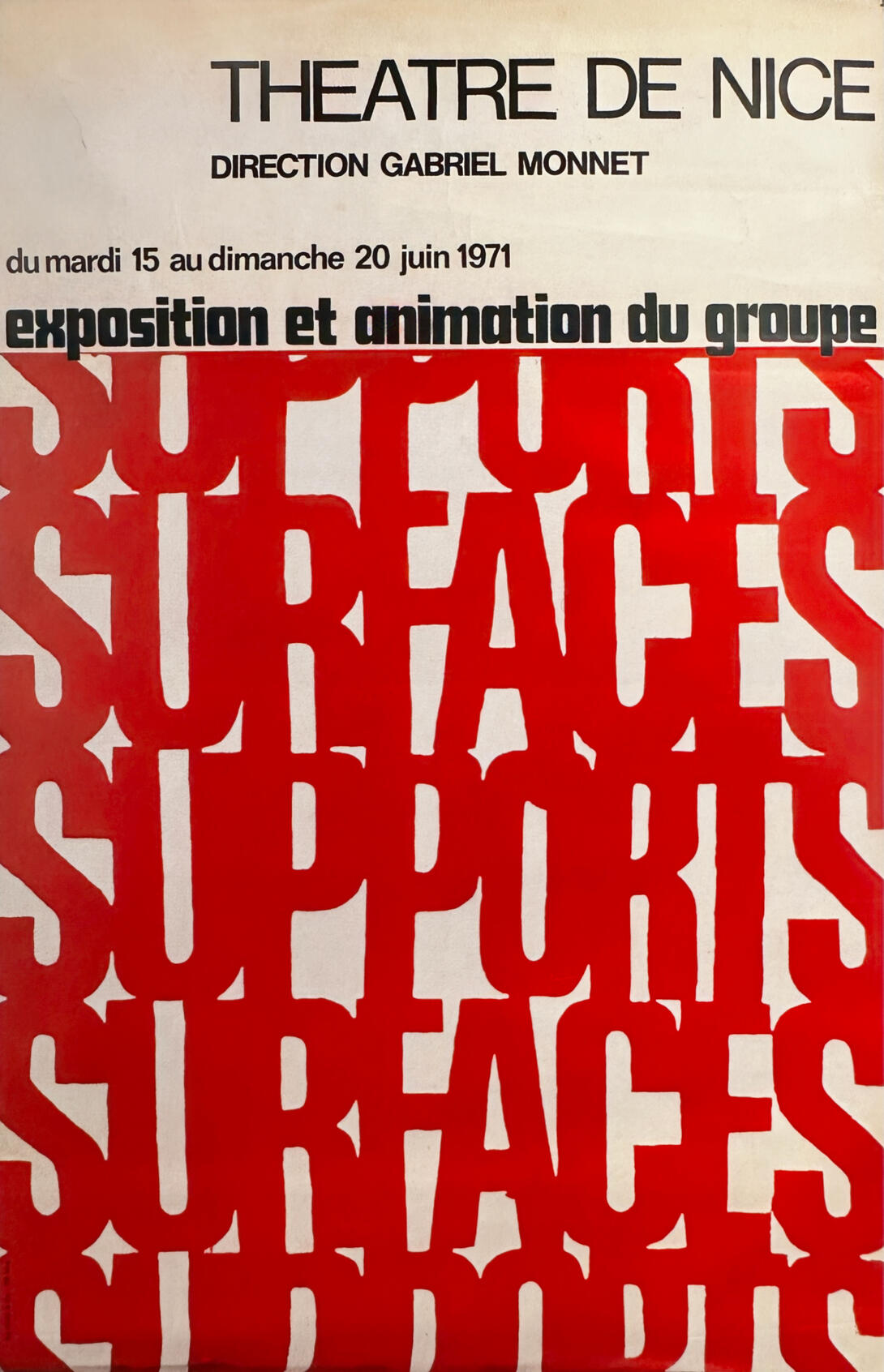 Cette dernière exposition du Groupe Supports-Surfaces, sous-titrée "exposition et animation du groupe", se tient au tout nouveau Théâtre de Nice, ouvert sous la direction de Gabriel Monnet et inauguré en 1970.